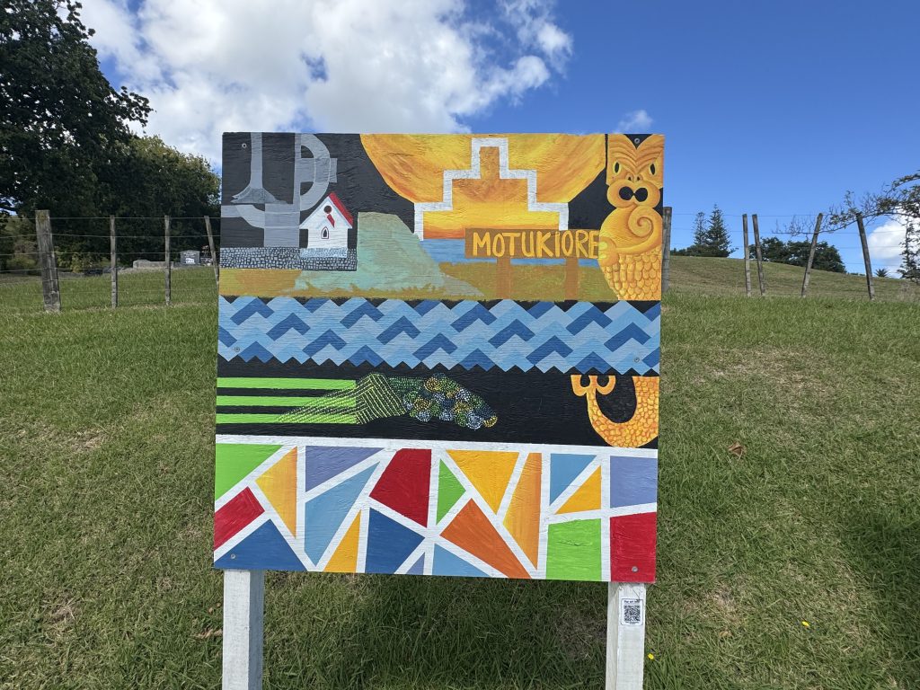 Colour Abstract – Representation of the many whanau who have migrated to Motukiore. Tangata not only maori whom have influenced the culture and history of our community.