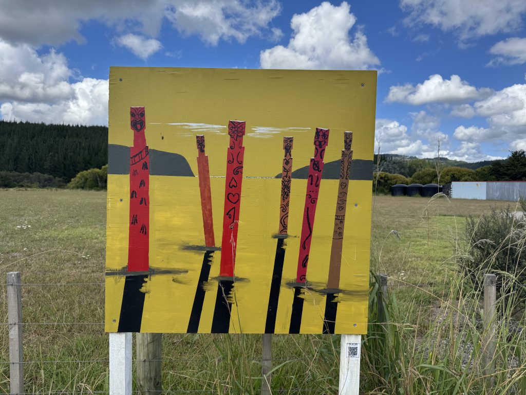 The pou represent six marae in the Horeke Districts, Tauratumaru, Puketawa, Mokonuiarangi, Te Rangatahi, Mataitaua and Motukiore, setting is where Kupe a great Rangatira and navigator of Hawaiki arrived, this painting depicts the arrival with descendants of each hapu emerging from the Hokianga Harbour.
